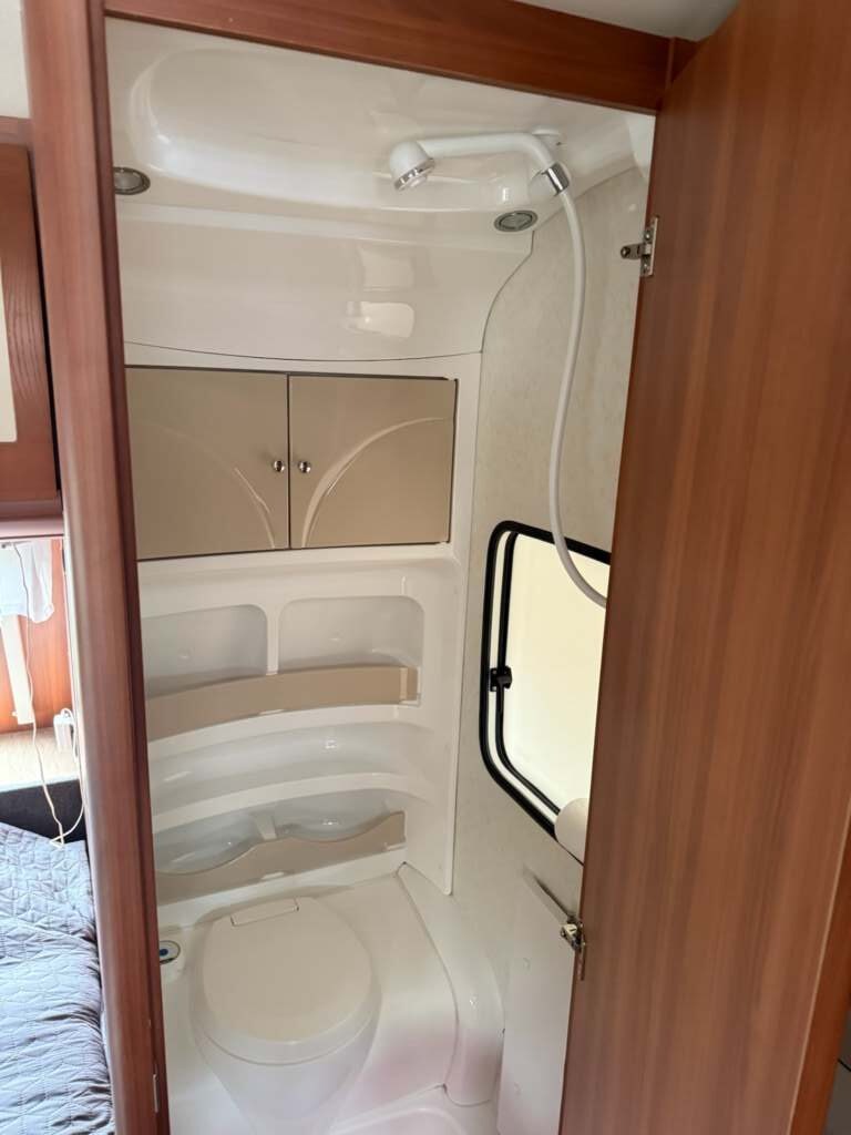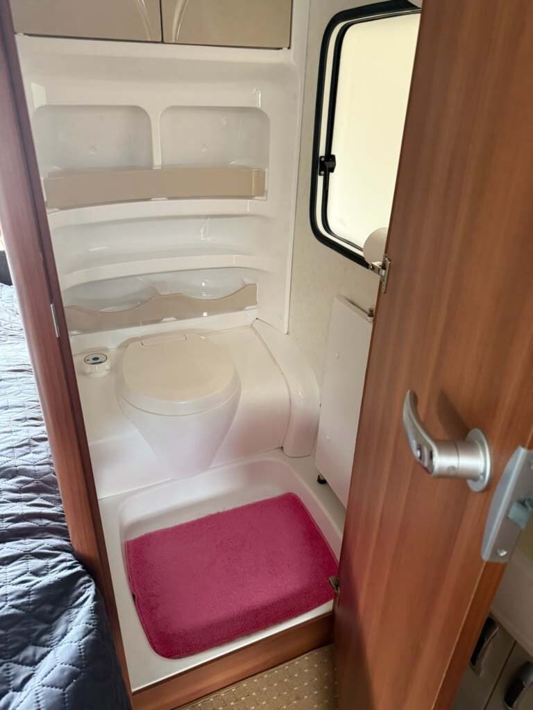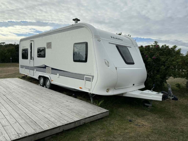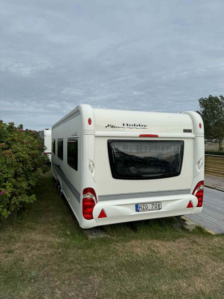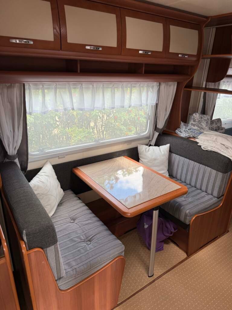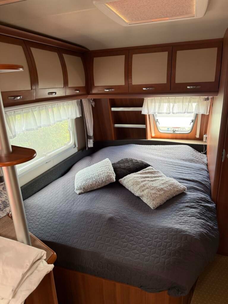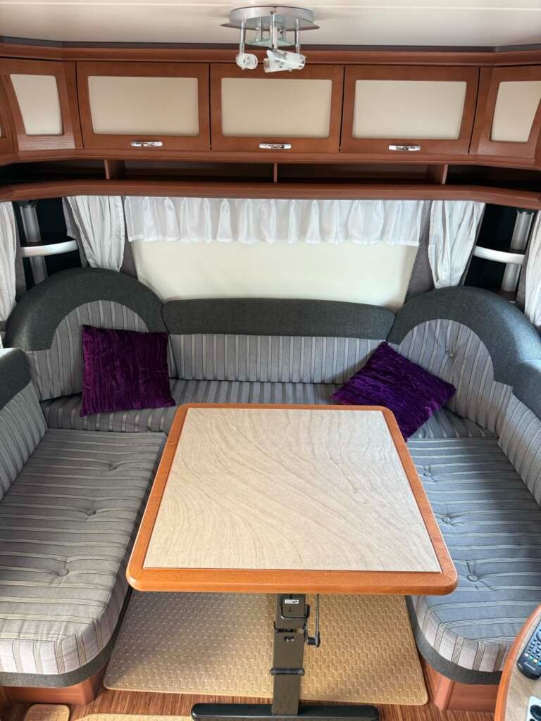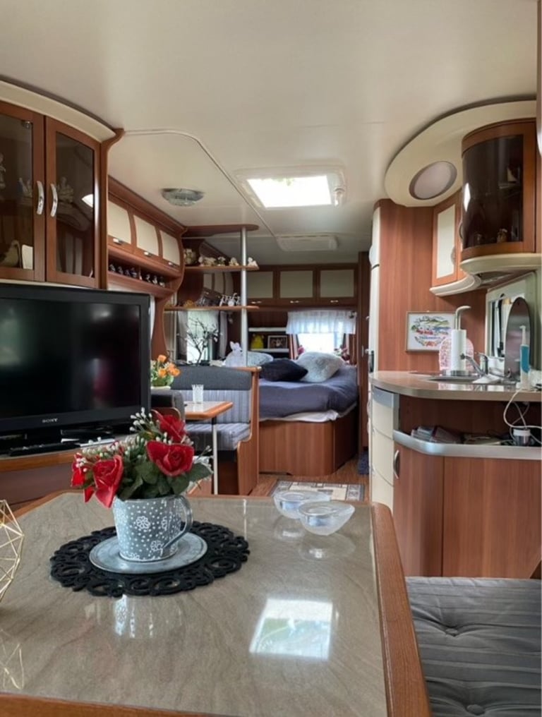 En ljus och trevlig husvagn tack vare stora takluckor – dessa kan givetvis täckas om du vill ha det mörkt och mysigt. Perfekt för semesterresan med familjen eller vännerna.